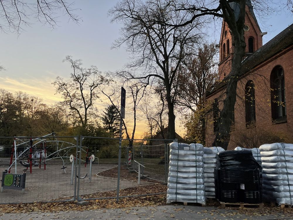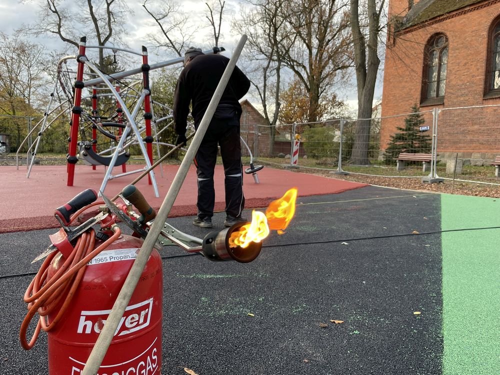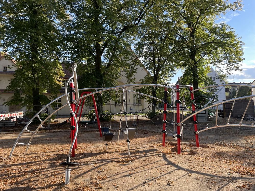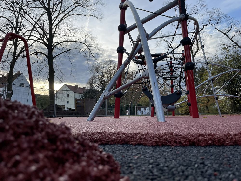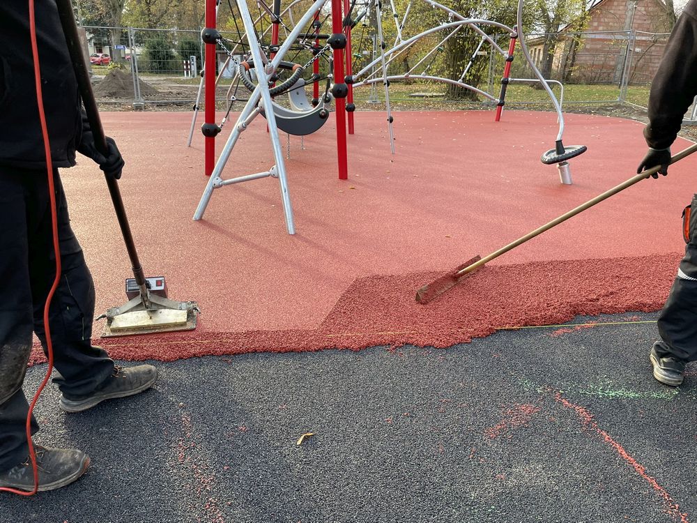 Regen und Kälte und wieder einige Wochen Stillstand auf der Baustelle… Doch in den letzten Tagen ging es gut voran und der neue Spielplatz ist auf der Zielgeraden! Die Arbeiten am Bodenbelag sind weit fortgeschritten und es ist deutlich erkennbar, wie das fertige Areal aussehen wird. Noch ein paar Quadratmeter Bodenbelag und die abschließenden Erdarbeiten rund um die Spielfläche – wenn das Wetter mitspielt, können wir bald Einweihung feiern. Vielleicht klappt es nachmittags am 1. Dezember 😉 Also drückt die Daumen…