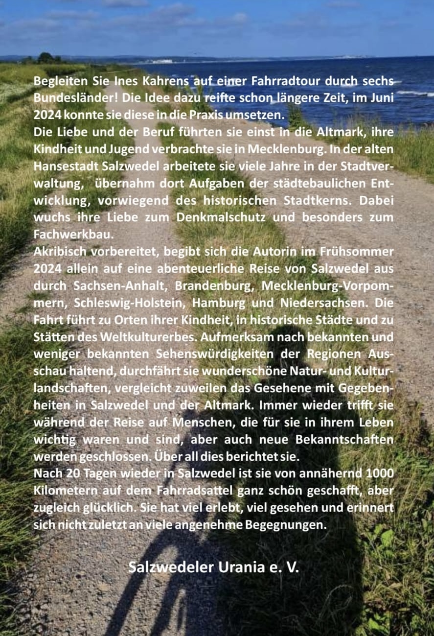 Gemeinsam mit der Urania Salzwedel laden wir euch am 10. Mai um 15 Uhr zu einer Autorenlesung mit Ines Kahrens in Charly’s Cafégarten ein. Dann könnt ihr die Autorin auf eine spannende und inspirierende Fahrradtour durch den Nordosten und Norden Deutschlands begleiten. Ines Kahrens startete im Frühsommer 2024 von Salzwedel aus zu einer abenteuerlichen Reise durch sechs Bundesländer: Sachsen-Anhalt, Brandenburg, Mecklenburg-Vorpommern, Schleswig-Holstein, Hamburg und Niedersachsen. Ihre Eindrücke, Geschichten und Entdeckungen hat sie in einer unterhaltsamen Mischung aus Reisebericht, persönlichen Begegnungen und überraschenden Einblicken festgehalten. Lasst euch an diesem Nachmittag auf eine Tour voller Freiheit, Natur und Neugier mitnehmen!
